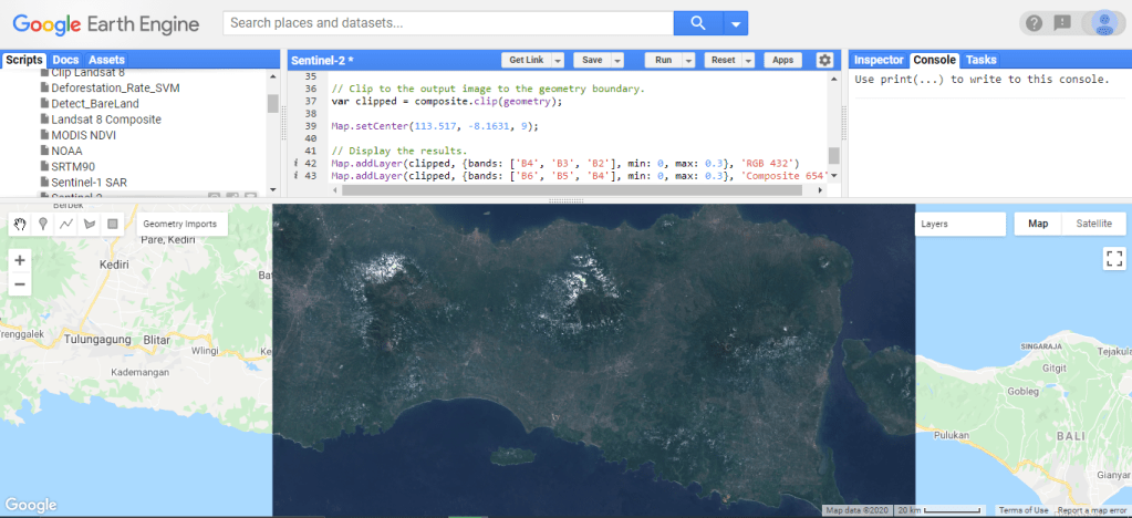 Map.addLayer(clipped, {bands: ['B4', 'B3', 'B2'], min: 0, max: 0.3}, 'RGB 432')