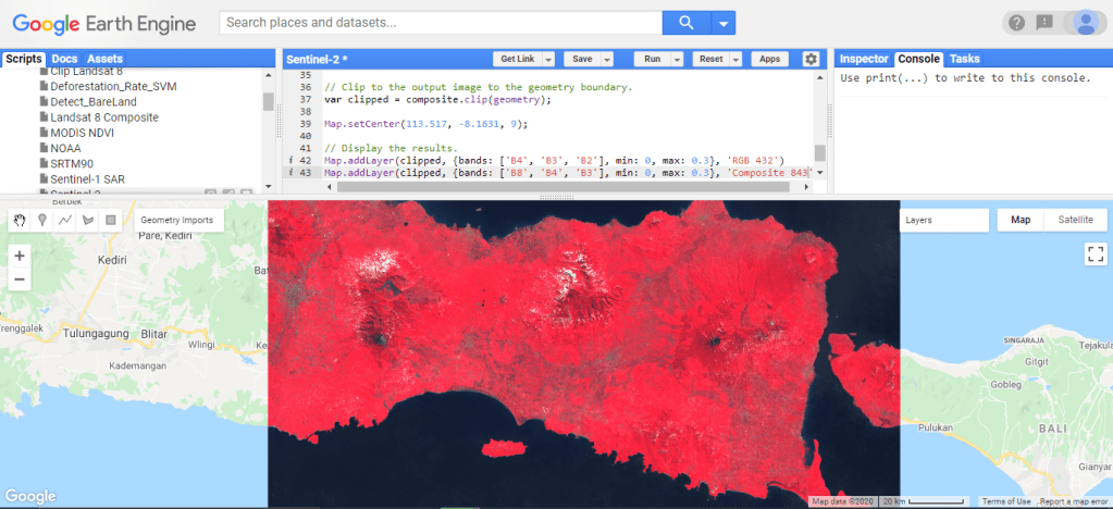 Map.addLayer(clipped, {bands: ['B8', 'B4', 'B3'], min: 0, max: 0.3}, 'Composite 843')