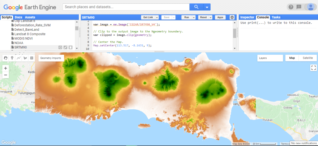 Map.addLayer(clipped, {min: 0, max: 3000, palette:palette}, 'SRTM');
