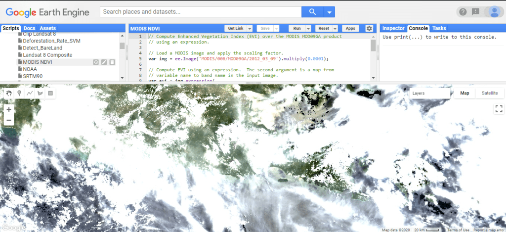 Map.addLayer(evi, {min: 0, max: 1}, 'EVI');