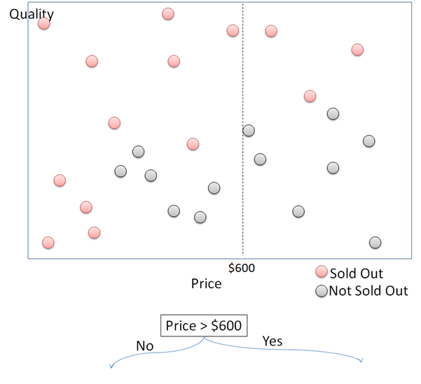 First, split the data points into two divisions by the price. Data points with price higher and lower than $600 are divided into right and left. For each of the side, split the data points again into 2 parts according to the quality. For data points with price above $600, they will be sold out if the quality is above 60, and not sold out if the quality is under 60. This process continues to divide those data points while growing the Decision Tree.