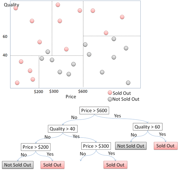 How Decision Tree works in simple way is expressed using the following data. This plot shows purchased goods plotted for their price in x axis and quality in y axis. The purchased goods are then divided into “sold out” and “not sold out”. This article will try to build a Decision Tree to detect whether a thing will be sold out or not according to its price and quality.