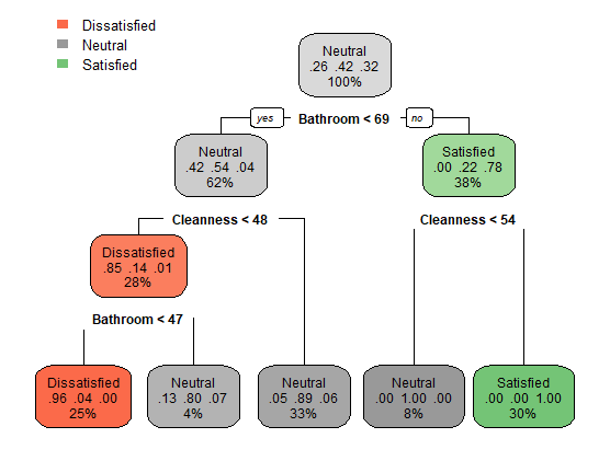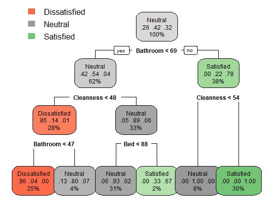 The second Decision Tree here has high accuracy of 89% in classifying the customer overall satisfaction. It takes “bathroom”, “cleanness, “bed”, and “food” s its predictors. Find the generated Decision Tree below.