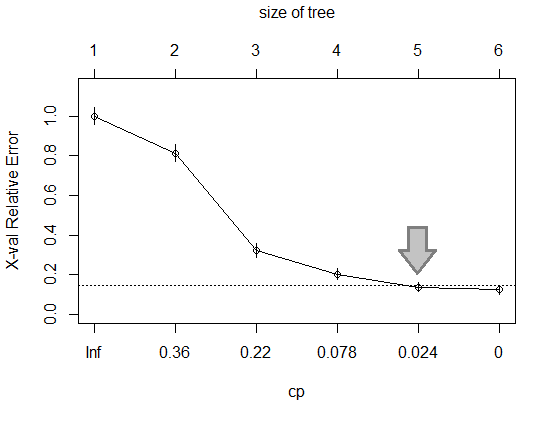 Another way to make the Decision Tree to be more simple is pruning. After the Decision Tree is grown, it can be seen as too complicated. Pruning can be applied to reduce less important branches of the Decision Tree so that it is less complicated. Cutting the less important branches is done at the least complex point where relative error does not decrease significantly anymore. The plot below shows the relative error in y-axis and cp in x-axis representing the complexity. The relative error drops when The Decision Tree gets more complex, or cp approaches 0. Figure out that c = 0.024 is the point where relative error does not decrease significantly anymore if the the cp is reduced.
