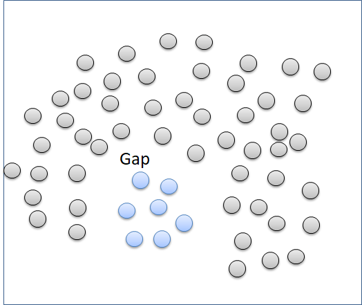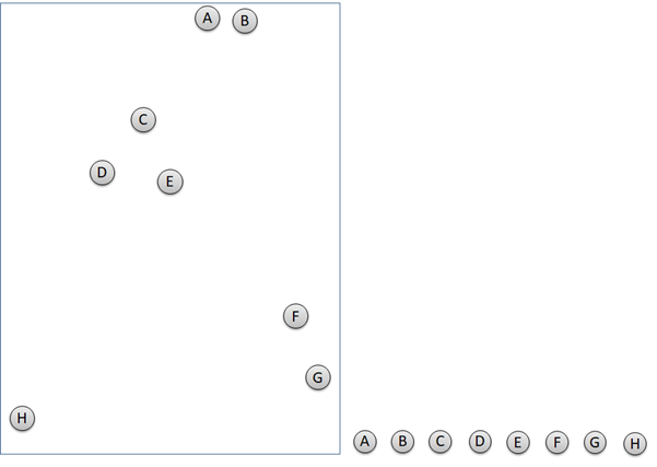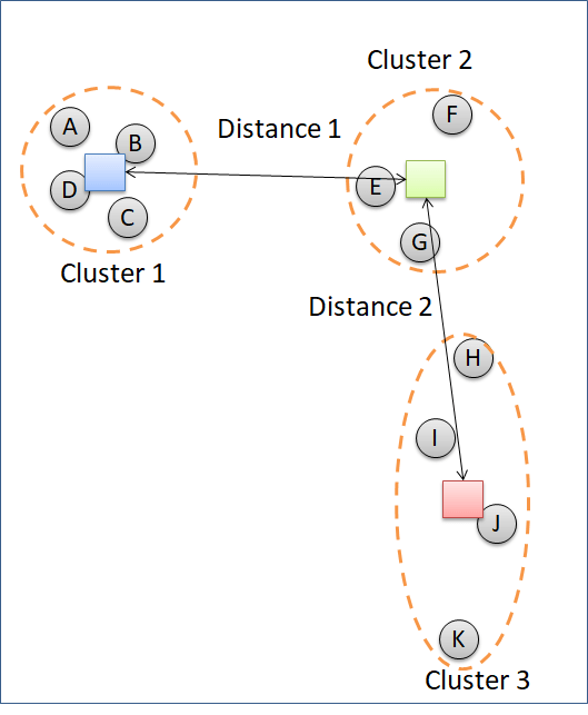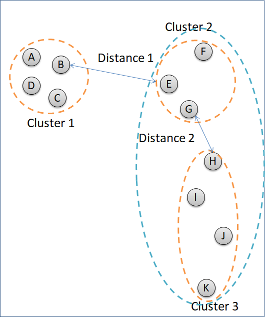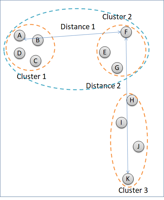 The example above uses the method = complete to cluster the data points. The method = complete groups clusters according to the least similar data points of the different clusters. In figure below, Cluster 2 is going to decide which cluster to combine with, Cluster 1 or Cluster 3. Distance of Cluster 1 and Cluster 2 is measured by point A and point F because the two points represent the least similar data points between the two clusters. Distance between Cluster 2 and Cluster 3 are calculated according to the distance of point F and point K. Cluster 2 will combine with Cluster 1 because the distance is shorter.