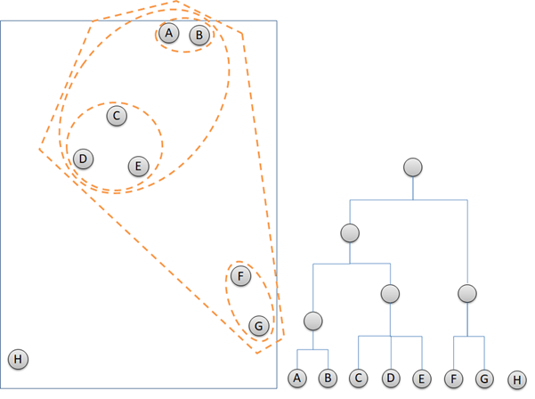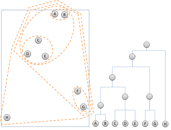The second linkage method in hierarchical clustering is “single”. This method groups clusters according to the most similar data points. In the picture below. Cluster 2 is grouped to the Cluster 3, instead of Cluster 1 because the distance of point G to point H is closer than distance between point E and point B.