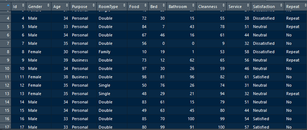 Now, we will run the hierarchical clustering to a little bit more complex data, the Hotel Customer Data. ”. The data is dummy data I created. The data contains the information of customers opinion of a hotel. There are 500 observations or rows in this data frame. Each observation represents one customer. There are 12 variables, with data structure as following.