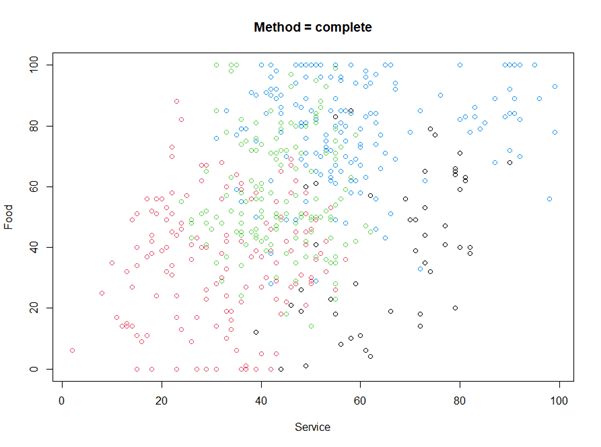 plot(CustomerData$Food ~ CustomerData$Service, col = Customer_Cut_k4$hclust, xlab = "Service", ylab = "Food", main = "Method = complete")
