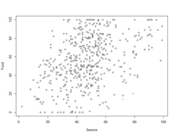 plot(CustomerData$Food ~ CustomerData$Service, col = Customer_Cut_k4_single$hclust, xlab = "Service", ylab = "Food")