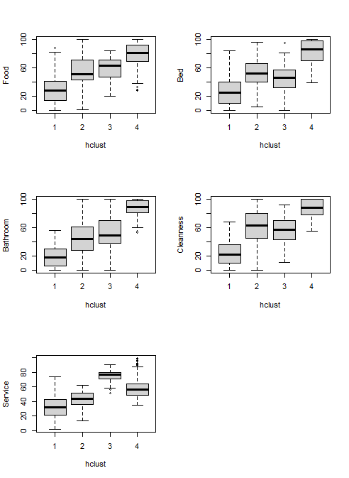 Customers in cluster 1 until 4 are distinguished by their data distribution of each parameter. Customers of cluster 4 had good impression to all of the parameters relative to other cluster customers. Customers of cluster 2 had worst opinion to the 5 parameters compared with other customers. Customers of cluster 1 were happy with the hotel service, but the other parameters were normal. Customer of cluster 3 had normal experience with all of the parameters.