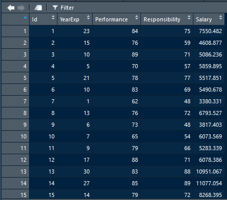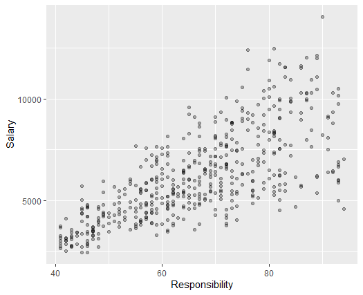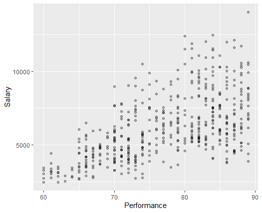 The “Salary” is expressed in dollar. Year of experience “YearExp” is how many years the employees have experience. Level of performance “Performance” and level of responsibility “Responsibility” measure employees’ working performance and responsibility load. They range from 0 to 100.