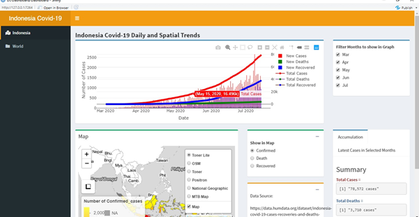 This project creates an interactive dashboard displaying tabular data in a chart and spatial data in a Leaflet GIS. It uses Shinydashboard package from R programming language. Visit the post.